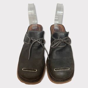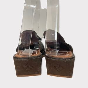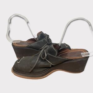 Features: Platform, wedge heel. Square toe. Leather tie across top. Accent contract