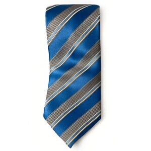 Beautiful, high-quality 100% silk mens necktie from the Donald J Trump signature series. Gorgeous Thai with blue gray and white diagonal stripes.