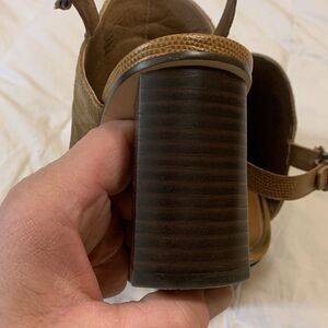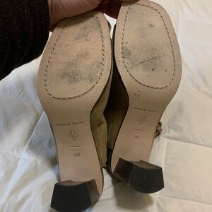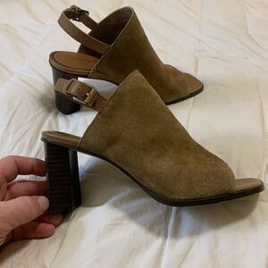 Suede, elastic band relief side. Adjustable back strap with buckle, stacked heal