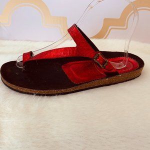 This Donald J. Pliner Made On The Beaches Of Spain Toe Strap sandal is made with a red metallic upper with an adjustable side buckle closure. Bottoms are made of form fitting cork and rubber sole. Size 8 - M