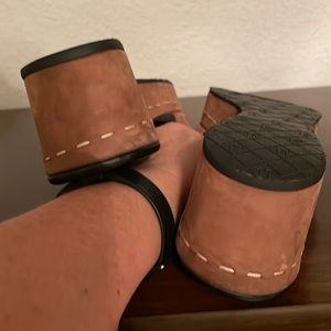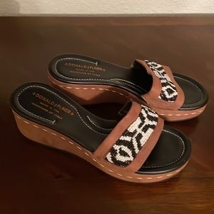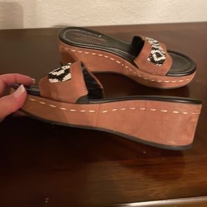 Donald Pliner brown suede slides with white stitching around the shoe, black & white decorative beaded pattern across top of shoe.