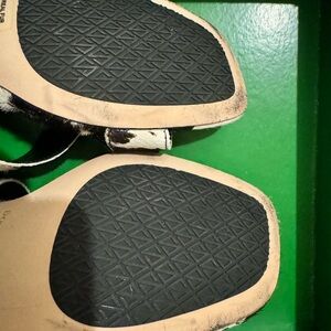 DONALD PLINER WOMEN’S PASHA COW PRINT HAIR CALF SANDAL IN BONE/BLACK SIZE 8.5
