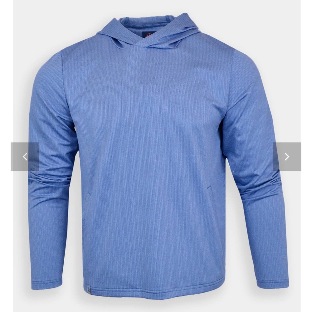 The Alasdair, Men’s Heathered Jacquard Hoodie by Donald Ross Sportswear. A heathered jacquard hoodie offered in three flattering color ways that add a subtle pop of color to any outfit. Constructed from our heathered jacquard fabric, this garment feels cool to the touch and stays dry with moisture-wicking fabric. The Alasdair offers full stretch and breathability for endless comfort on and off the course.