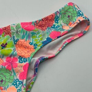 Vibrant floral bikini bottom. Features a mix of colors for a bold look. Perfect for summer.