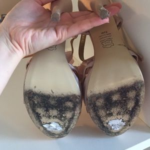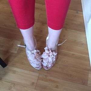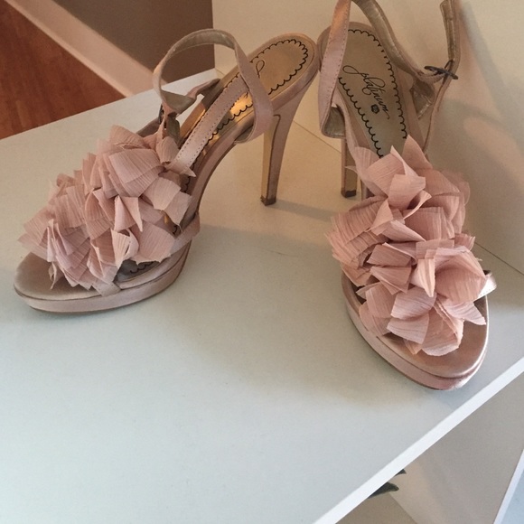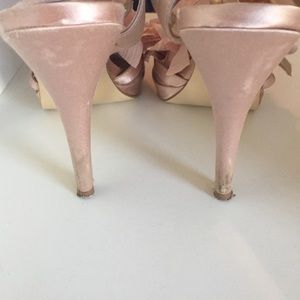 Color is a pale pink/blush color. Great dressy sandal as a statement shoe. I only wore these twice but once was an outdoor wedding so there is some wear on them (shown on pics). Heel height is about 4 inches.