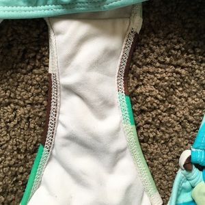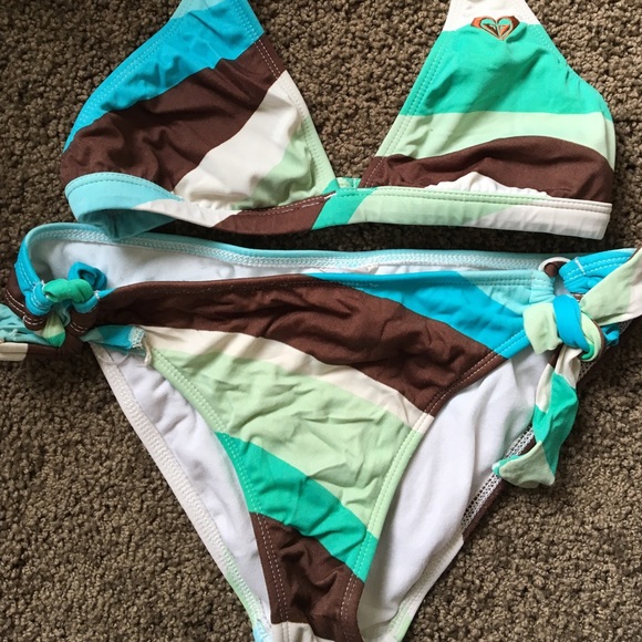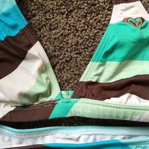 "Rosy" brand two piece swim suit. Worn once. Tie on right hip got stuck in my dryer so there is a tear, but still functions appropriately and is hardly noticeable.