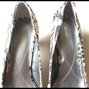 Fun & unique black/white abstract pattern 3"heels. Canvas material, whip stitch bows on the toe (small yellow mark on R, see pic), minimal dirt on the heels (see pic) but still in EUC! Wore these a few times to work. Pairs well with almost anything. A true conversation piece. Purchased at the Naturalizer outlet. Style is called KAMI. 🐼