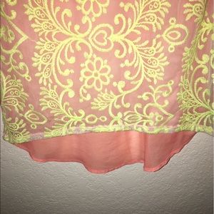 *PRE-LOVED* Coral & neon green/yellow short sleeve top with lace detail front & cage detail sheer back. Very unique & cute! Perfect with a white cami underneath. Shorter in the front, longer in the back. Can fit XS/S. Worn a handful of times. No flaws! Ask ❓, more 📸 upon request .. ❌trades ❌holds, ✅bundles, ✅offers using buttons ✌🏾&❤️
