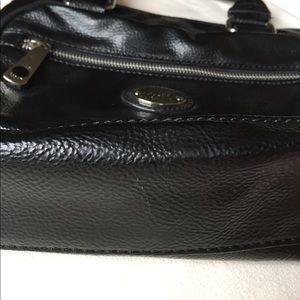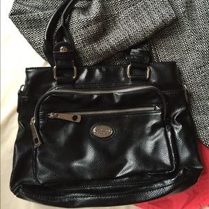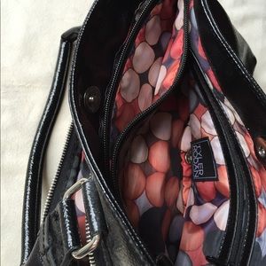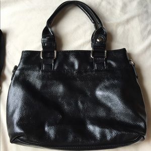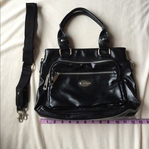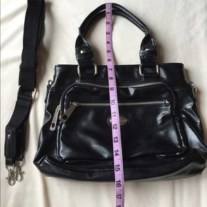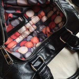 Don't let the size of this bag fool you! It has room for everything! 2exterior pockets(1with card holders-like a built-in wallet), magnetic closure, open top, 2 deep interior pockets, 3rd middle pocket zips, another side pocket zips shut, 1 button pocket, 2side pockets (cellphone or sunnies). Polka dot interior, black patent vinyl exterior. Handles or adjustable strap for cross-body style. Slight scuff on bottom(see pic). No longer use this. Perfect for trips! 🎏