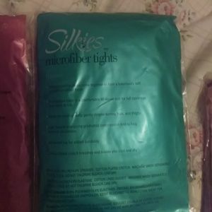 FINAL Price! 3 unopened Silkies size Large, 1 pair dark brown microfiber tights with control top, 1 pair mocha Silkies Ultra total leg control support and 1 pair beige sheer toe to waist.