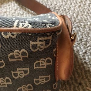 Good used condition gray jacquard and tan leather mid-size purse: 12x7x4.5. Please be advised that the leather (although not worn or broken) has aged slightly and the interior definitely shows signs of normal wear - there's a small tear where the key fob is sewn in. Small spots on the bottom corners show wear (see last pics). Condition is reflected in the price. Still a great purse - he size/shape doesn't quite work for me. Great price for authentic!