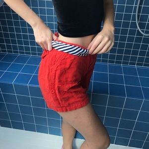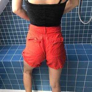 Orange loose shorts with black and white inner trim. Model folded down top to show inner trim.