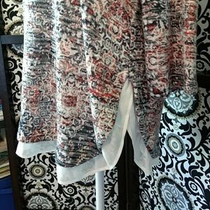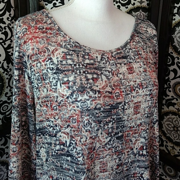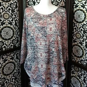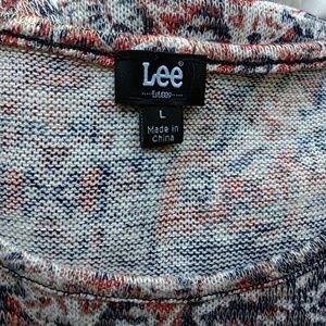 Size Large Lee 3/4 sleeve, lightweight dark red and blue top with white chiffon trim. Very cute and in great condition π