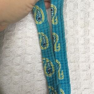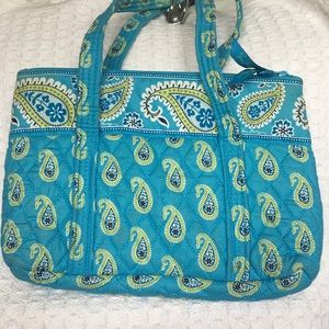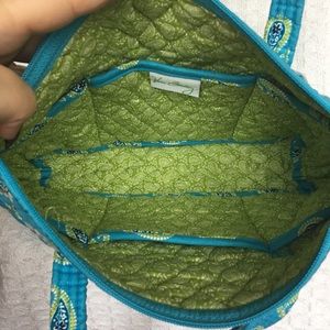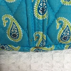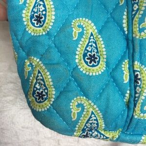 Super cute paisley bag with lots of pockets for organization. Good used condition - some staining throughout from normal use. Dark brown stain on bottom corner as shown in pictures.