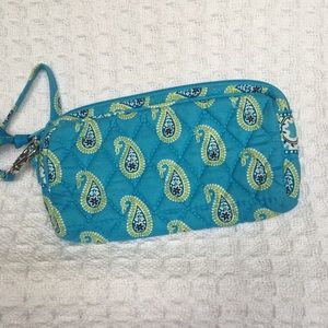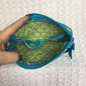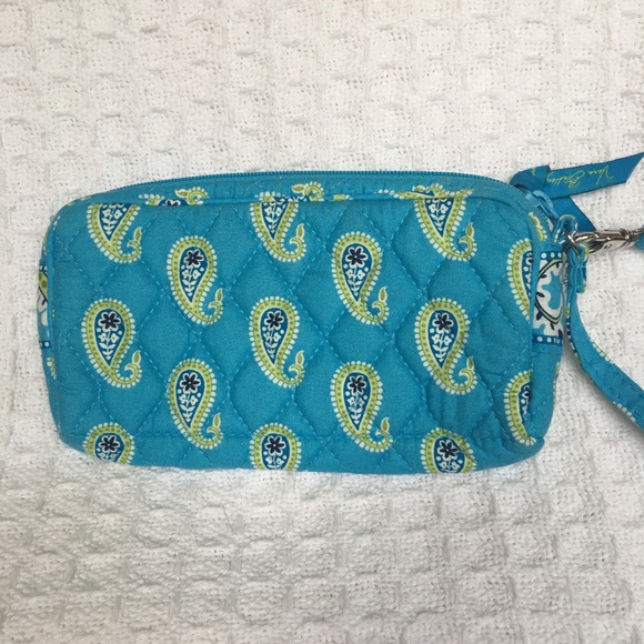 Green and blue paisley wristlet in gently loved condition. Perfect for cosmetics, cell phone, jewelry, and more.