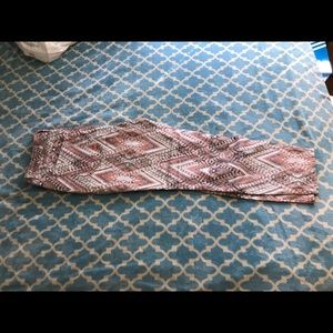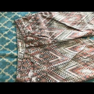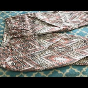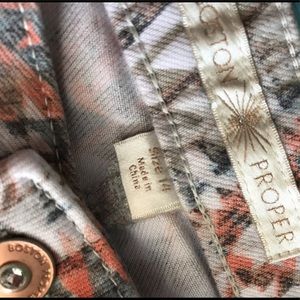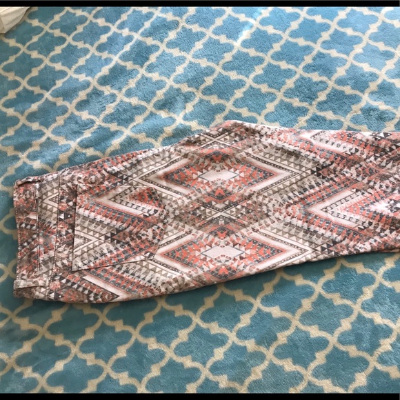 Great ankle pants by Boston Proper. Worn a few times. Colors are salmon, tan, grey, and off white. Awesome chevron type pattern. Inseam is 27 1/2 in. In great used condition! Needs a new home!