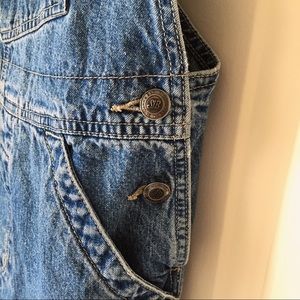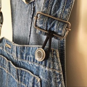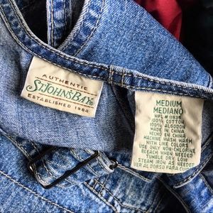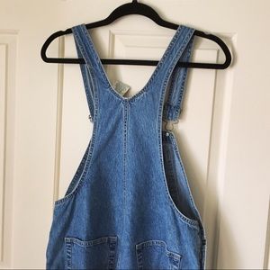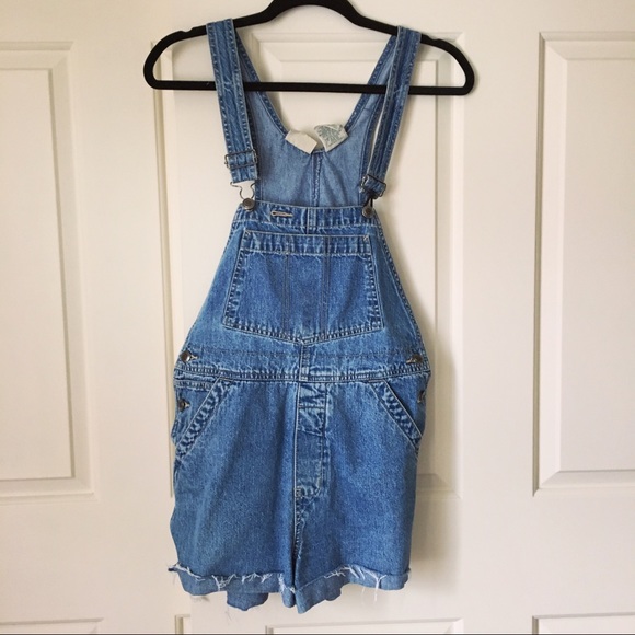 Hand cut denim overall shorts from the 90s. Buttons up on each side near the pockets. One of the clasps broke and is currently fastened with a hair tie but could be replaced. “St Johns Bay” brand.