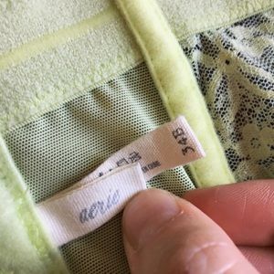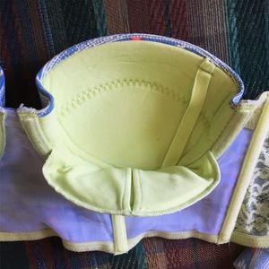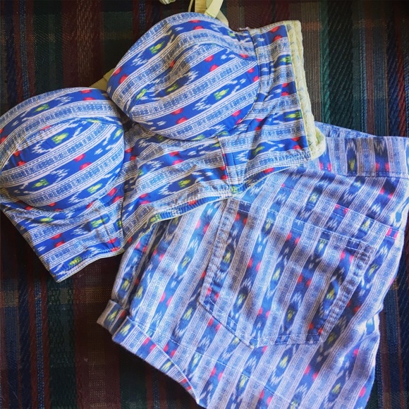 Push up bralette and matching shorts. Adorable spring/summer set in blue, white, neon yellow, and pink. Lace back and hook closure. Can be worn with straps or like a bandeau. Top is size 34B and bottoms are size 4.