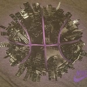 Men's nike tshirt with a basketball and cityscape graphic. Excellent condition, very soft, true to size. Grey tshirt, graphic is black and purple with purple nike logo in bottom right.