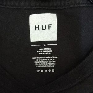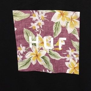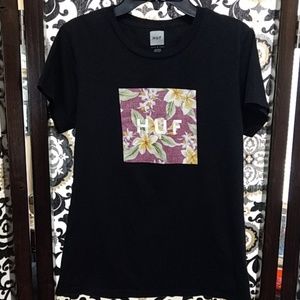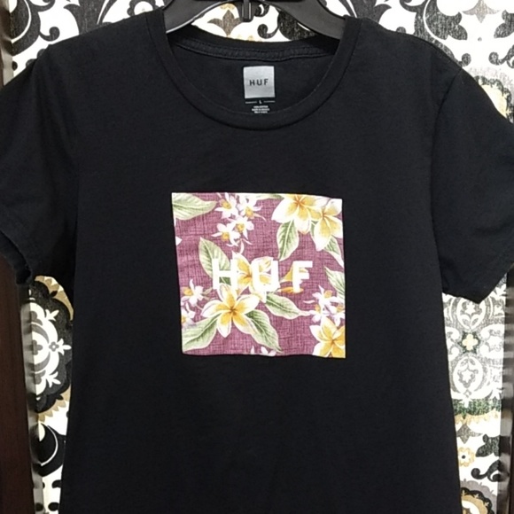 Juniors Size Large semi-fitted black HUF short sleeve t-shirt with purple, yellow and green floral decal on front. Great condition π