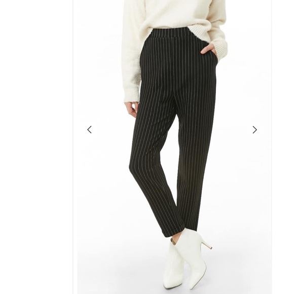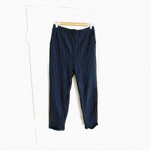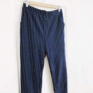 pair of knit pants featuring an allover pinstriped pattern, elasticized waist, front slanted pockets, pull-on styling, cuffed hem, and a slightly relaxed silhouette.