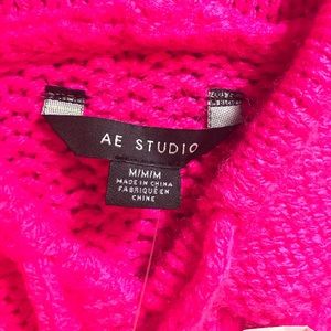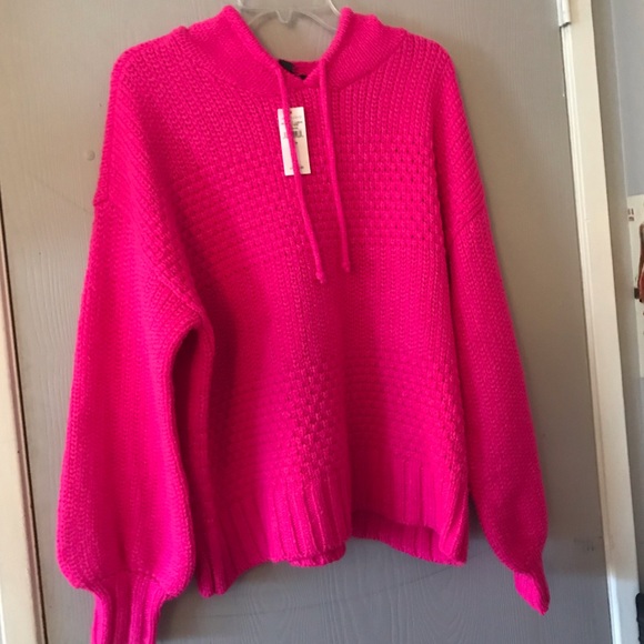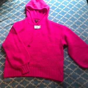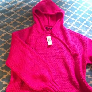 This is an awesome Bright Pink pull over sweater with a hood ๐ its brand new with tags super soft and cozy. Its a size M but will also fit a L ๐