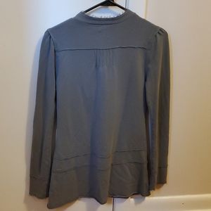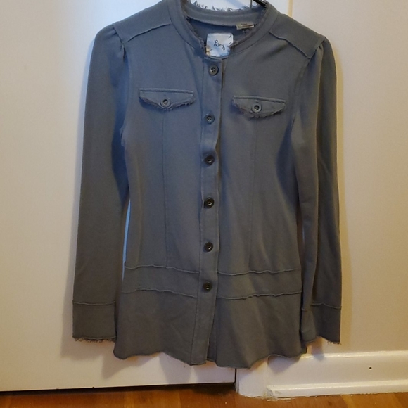 Long sleeved button down shirt with faux pockets and a frayed hems. This shirt has some good stretch and is very versatile.