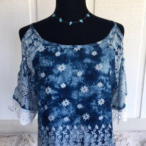 PRICE FIRM Plus size blue floral cold shoulder top with crocheted lacy trim on sleeves. There is no stretch to material. Measurements are approx. and taken lying flat Bust measured across from pit to pit, length measured from top of strap to hem 2XL: Bust-24” Length-28” Closet closing for good June 30th❣️ April my closet will be on hold. May & June will be my final months of sales. I have already reduced prices 45-50% on boutique items. Final price or Price firm are firm.