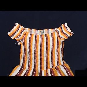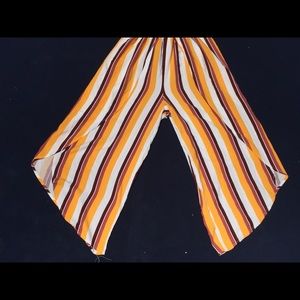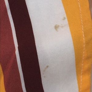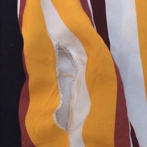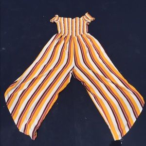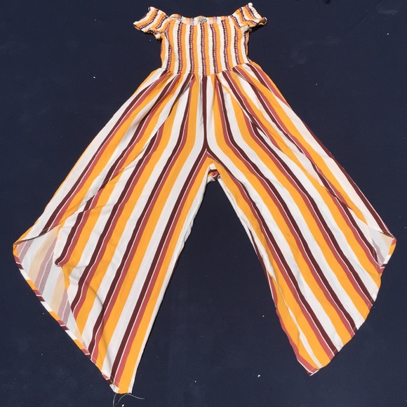 Off the shoulder jumpsuit. Stretchy and elastic on the chest portion, and flowy and breathable on the leg portion. The sides of each pants has a slit thats opens all the way to the waist and there is a stain and a hole on the bottom of the left leg. worn twice