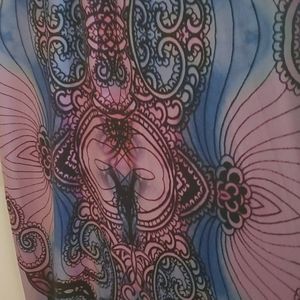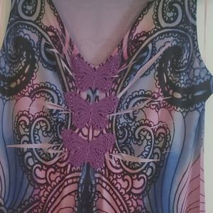 Size Small Dress with light purple and blues with black paisley kaleidoscope funky fun design. Has 3 purple butterfly details and is a very light weight and soft dress.