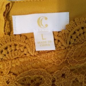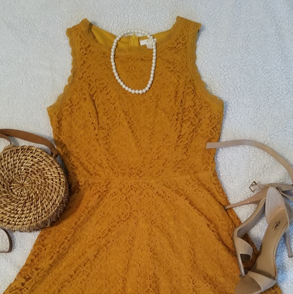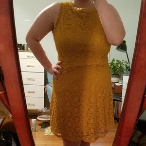 Super sweet yellow lace dress. High neck, fit and flare, A line. Bought but only tried on. Has a matching satin/polyester blend skirt liner.