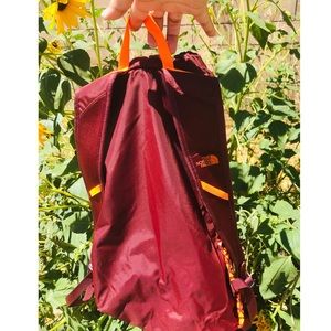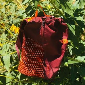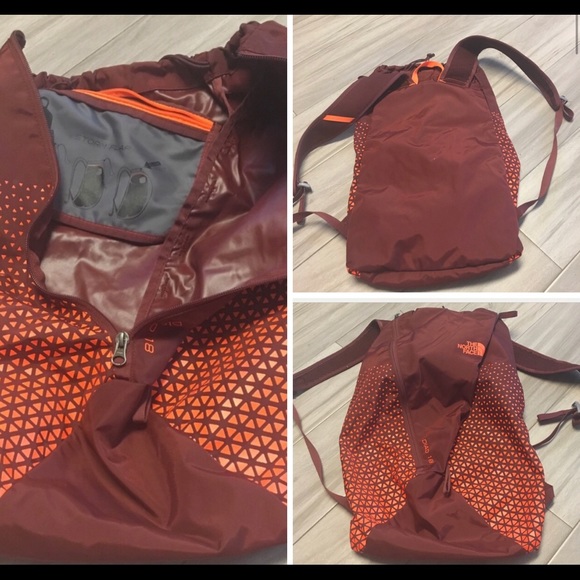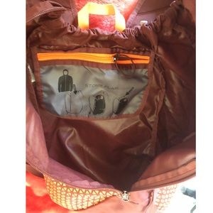 Dark burgundy with orange design. Hardly used & in great condition. Slanted zipper with inside pocket.