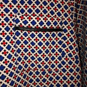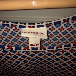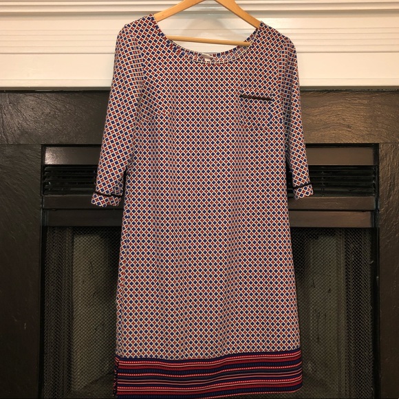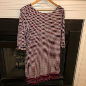 Adorable 3/4 sleeve dress in red white and blue pattern with black faux leather trim. Used to have a belt, but I no longer have it. Would work great without or with a skinny black belt. Very comfortable! Perfect for fall or winter with tights!