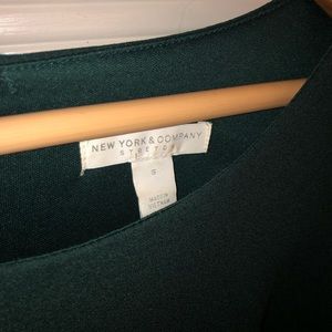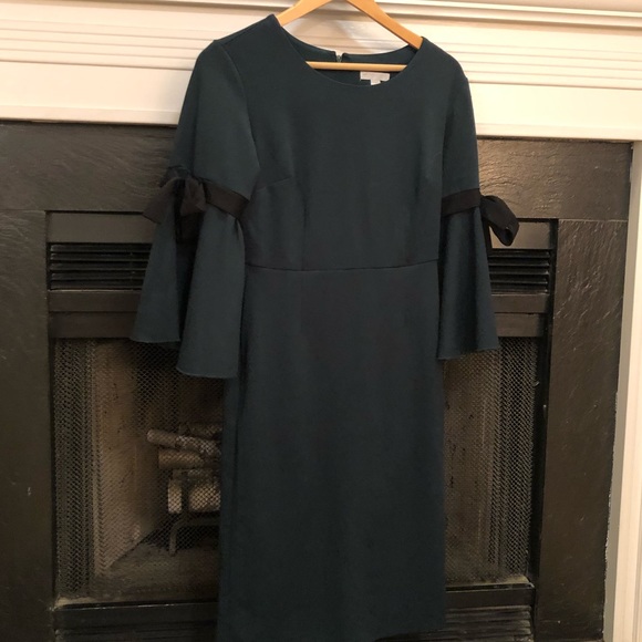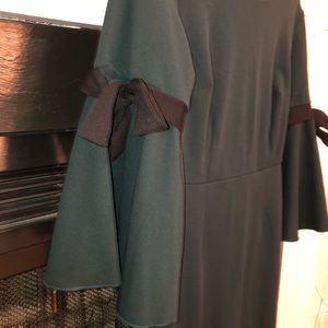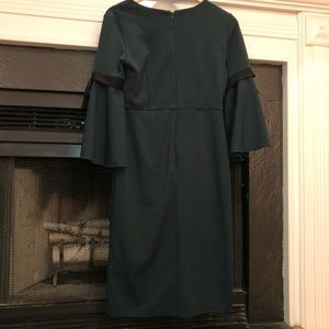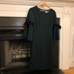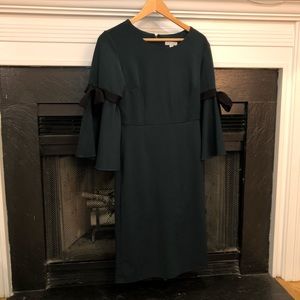 Beautiful New York & Co midi dress with bell sleeves and bows. Dark green/hunter green with black bows. Very comfortable and stretchy material. Perfect for cocktail hour, weddings, or networking events in the fall/winter! Excellent used condition and no blemishes! 3/4 sleeves. Size small but runs more like a 6/8.