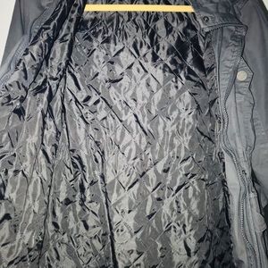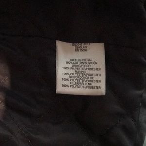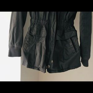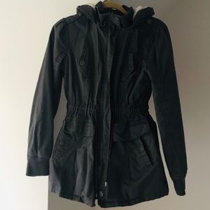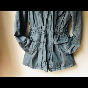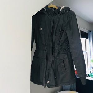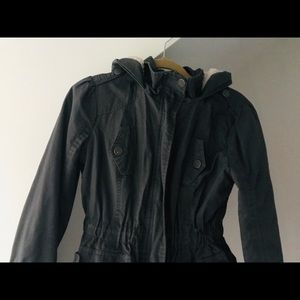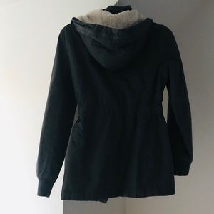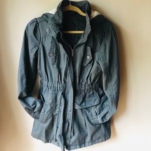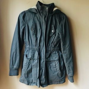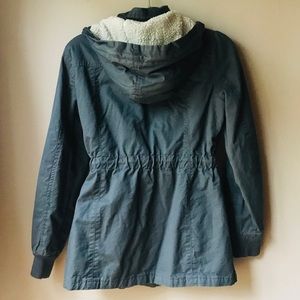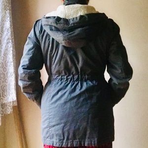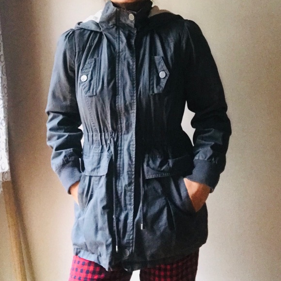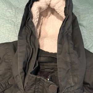Warm and comfortable. Perfect for chilly, fall weather. Neck folds up for added warmth. It’s missing the faux fur that zipped around the hoodie. Only the side pockets are functional. I pulled the tag for comfort, and I can’t remember where I bought it. I think Old Navy. It’s a size XS, but refer to approximate measurements for reference.
