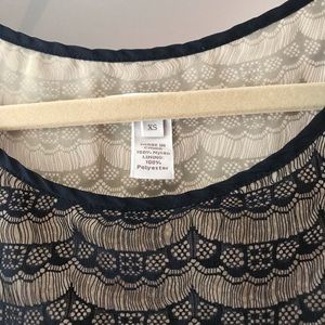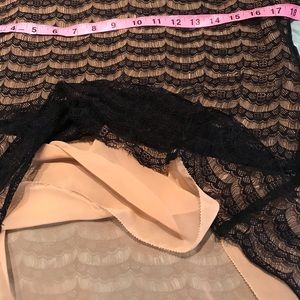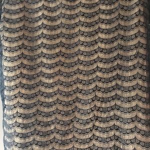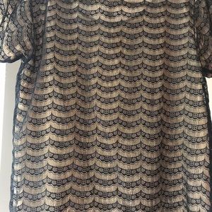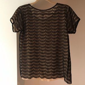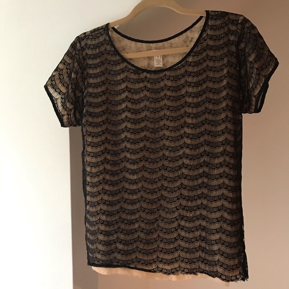 Sheer tan blouse with a pretty black lace overlay. Doesn’t stretch. Approximately: