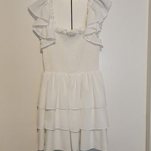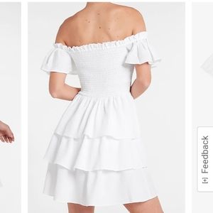 beautiful teired ruffle dress- designed with an off-the-shoulder ruffle neckline, ruffle short sleeves, a smocked bodice, and a ruffle-tiered skirt. Style with a jacket, booties, or sandals.