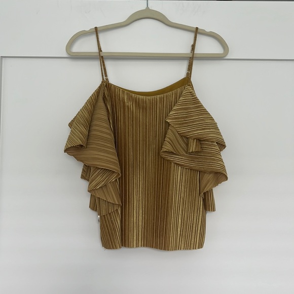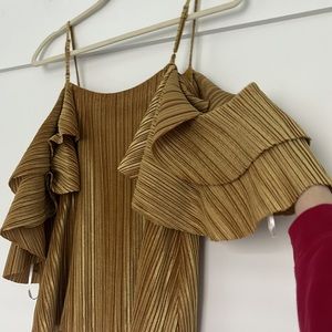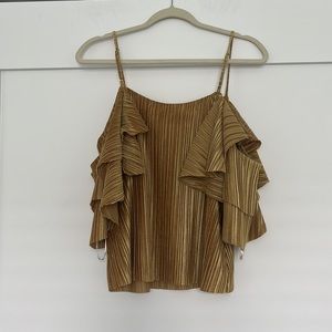 A stunning BNWOT blouse/top with flouncy cold shoulder style sleeves and lovely gold velvety pleated fabric. Fully lined. Has only been worn to try on. Size S, shell is 95% Polyester, 5% Spandex, lining is 100% Polyester. Dry clean only, can be dry cleaned before shipping but it may cause shipping delays. Brand is Dance&Marvel from Forever21. Comes from a pet friendly home, will be lint rolled prior to shipment. 👑