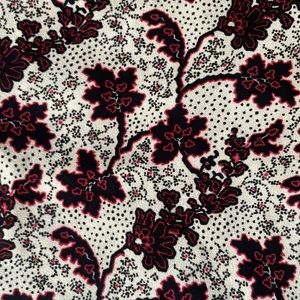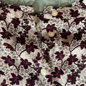 3 button closure in back. Cap sleeve. Cream with a black and red vine, floral pattern. Pit to pit 20” Shoulder to hem 24” Bundle and send offer Thanks for looking