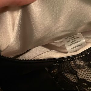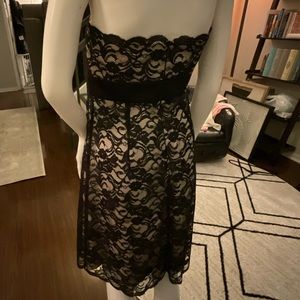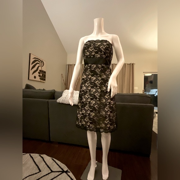 Timeless & Flattering!! Strapless black lace mini dress with zipper closure in back and boning in top of dress. Satin sewn in “belt” under chest creates a super flattering figure. As someone who hates wearing a strapless bra, this dress makes it super easy and comfortable. The boning is awesome and I’ve never had trouble keeping a strapless bra in place with this dress. Great for weddings or other special occasions. Can also be dressed down with jean jacket. LOVED & WORN W CARE ❤️