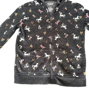 This charming little girl's hoodie features a delightful unicorn print, perfect for adding a touch of magic to any outfit. The dark gray color provides a versatile and stylish look. Ideal for everyday wear. It's a lightweight zip up hoodie with front pockets. size 7. lightly used but still in great shape. no stains, rips or odors. smoke free, pet free home.