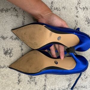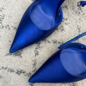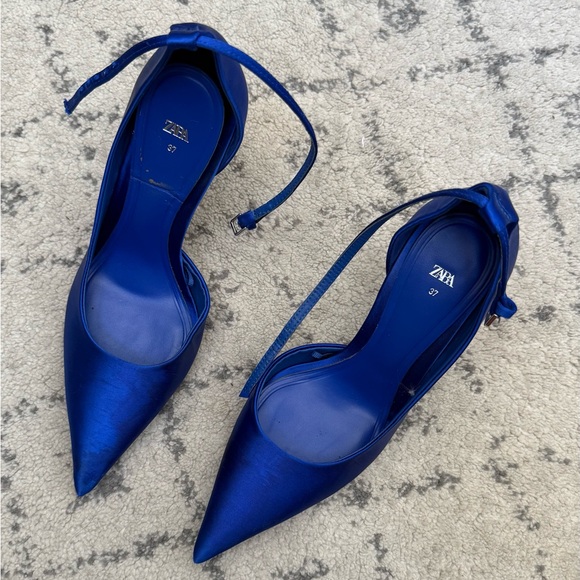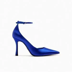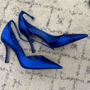 These Zara heels feature a striking blue hue and a sleek stiletto design, complete with a stylish ankle strap for added elegance and support. The pointed toe and satin-like finish enhance their sophisticated appeal, making them a perfect choice for any chic occasion.