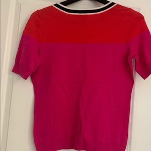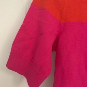 Color-block is in this season! This cute Color-block short-sleeve top has the perfect pops of color for spring and summer! Itβs super-soft, short-sleeve w/ a navy/white striped crew-neckline with hot pink and orange hues.