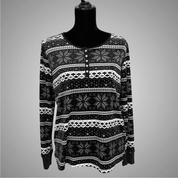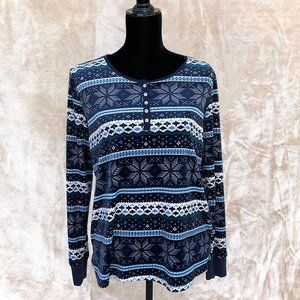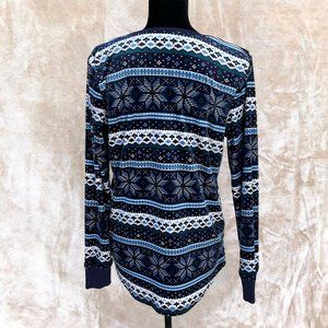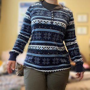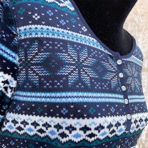 Super Soft! Arctic Pajama Top: Super warm and cozy pajamas in a Fair isle pattern inspired wintertime blue and white snowflake theme! Very loose and very stretchy! Elastic wrists fit nice and snug. Match with your favorite pair of sweatpants and a warm drink for a truly relaxing stay-at-home winter day! Barely worn, like brand new! Nylon, polyester blend. Machine washable!