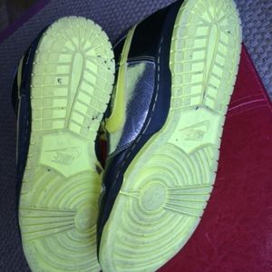 *DONATED* Presenting a dynamite pair of NikeiD customized metallic silver, neon yellow and black high tops. These were designed to be showy in the gym when teaching classes. Worn less than 10 times, they're in fantastic condition! The word "BEZEL" is embroidered on the back heel cup, which is barely noticeable unless pointed out. These really shimmer & shine and are seriously hard to ignore! Very unique. If you like to sparkle, these shoes are for you. Not found anywhere!