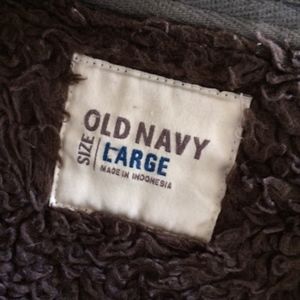 *DONATED* Toasty warm, this Old Navy nubby fleece lined sweat jacket is perfect for fall/winter. Chocolate brown lining offers an earthy neutral contrast to the weathered gray outer layer. Heavy duty metal zipper, double front pockets. Hood can be "popped out" for a cute effect or tucked in for easy head coverage. Tiny snag in the front near the bottom band of the jacket adds to the overall distressed/weathered vibe of the garment (last pic). Size Large.