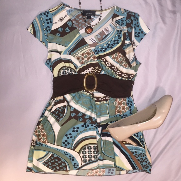 Blouse features a neckline with a wrap look and a faux belt with gold buckle.