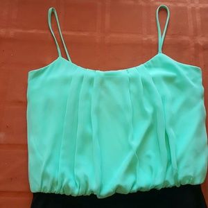 Gorgeous aqua/black cocktail dress. Spaghetti straps on top, and layers and rouching on the bottom. This dress hugs your curves and gives anyone an amazing shape! Very comfortable!