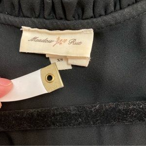 Pretty Anthropologie tank top by Meadow Rue. Black background with a design of feathers and leaves in watercolor-y blue, green, pink, and yellow. Knit body with a polyester yoke, ruffles around the armholes and neckline, and neck ties. V-neck and front pleat.