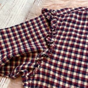 Something Navy Plaid Flannel Ruffle Shoulder Button Up Top. This is in good used condition